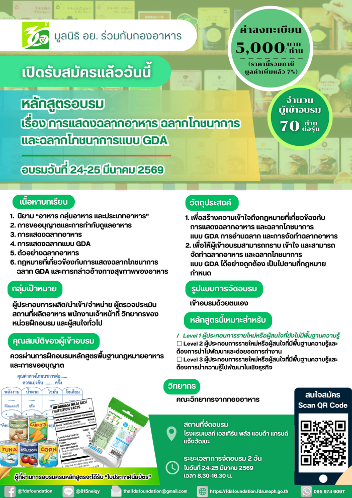 [อบรม] หลักสูตร “การแสดงฉลากอาหาร ฉลากโภชนาการ และฉลากโภชนาการแบบ GDA” วันที่ 24 - 25 มีนาคม 2569