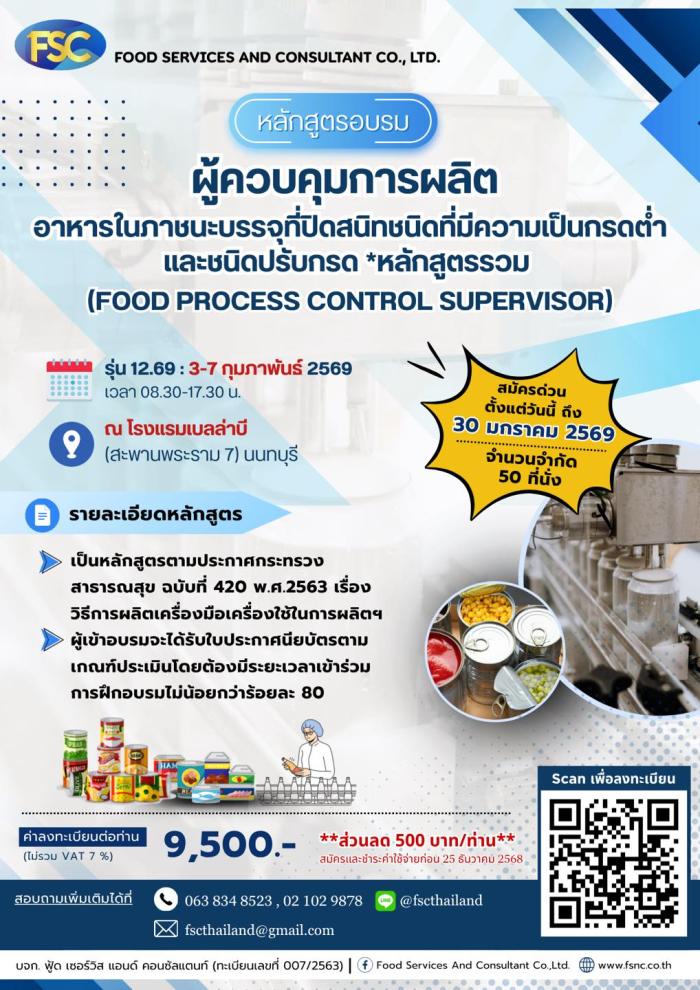 [อบรม] หลักสูตร “ผู้ควบคุมการผลิตอาหารในภาชนะบรรจุที่ปิดสนิทชนิดที่มีความเป็นกรดต่ำและชนิดปรับกรด (หลักสูตรรวม)” วันที่ 3-7 กุมภาพันธ์ 2569