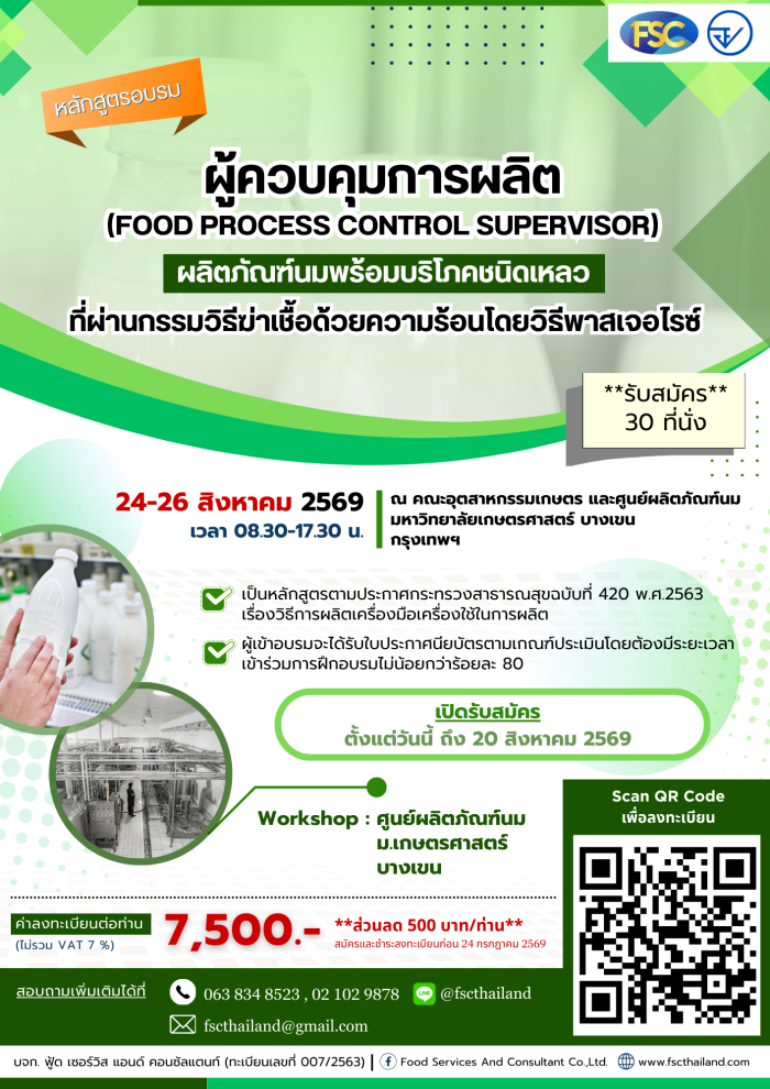 .[อบรม] หลักสูตร "ผู้ควบคุมการผลิตผลิตภัณฑ์นมพร้อมบริโภคชนิดเหลวที่ผ่านกรรมวิธีฆ่าเชื้อด้วยความร้อนโดยวิธีพาสเจอไรซ์" วันที่ 24-26 สิงหาคม 2569