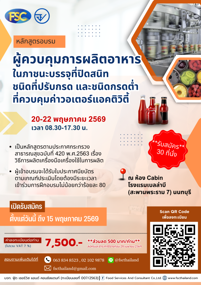 [อบรม] หลักสูตร "ผู้ควบคุมการผลิตอาหารในภาชนะบรรจุที่ปิดสนิทชนิดที่ปรับกรดและชนิดที่มีความเป็นกรดต่ำที่ควบคุมค่าวอเตอร์แอคติวตี้ (หลักสูตรปรับกรค)" วันที่ 20-22 พฤษภาคม 2569