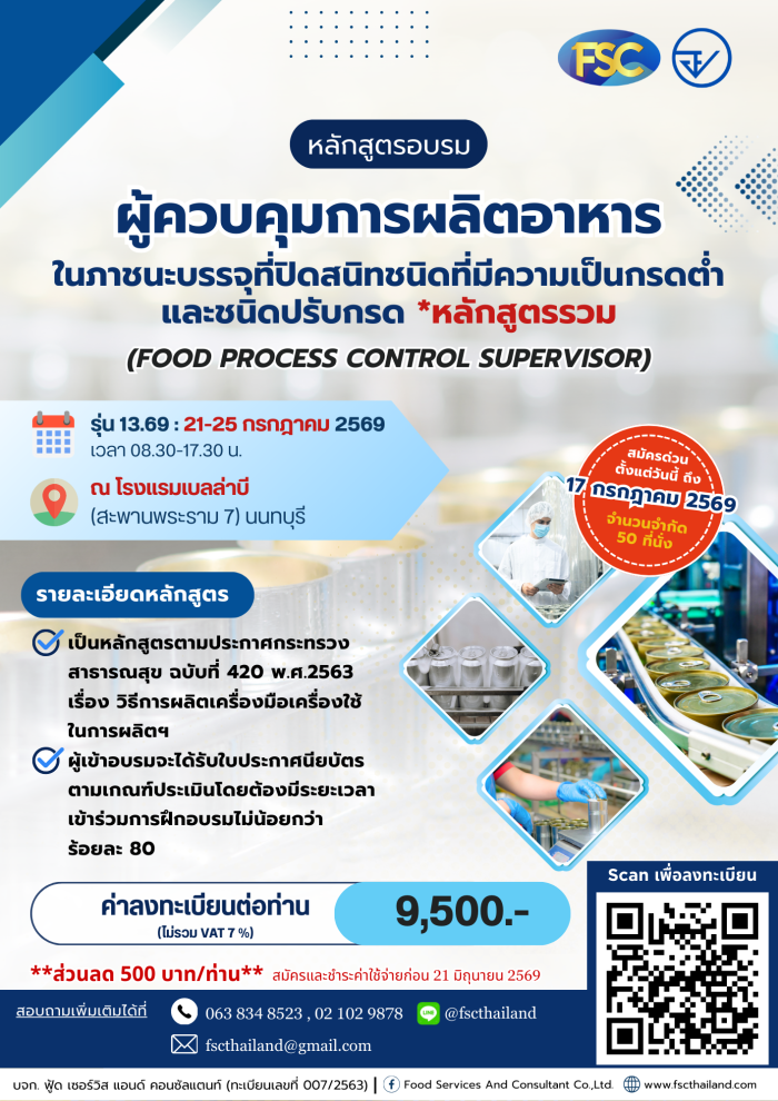 [อบรม] หลักสูตร "ผู้ควบคุมการผลิตอาหารในภาชนะบรรจุที่ปิดสนิทชนิดที่มีความเป็นกรดต่ำและชนิดปรับกรด (หลักสูตรรวม)" วันที่ 21-25 กรกฎาคม 2569