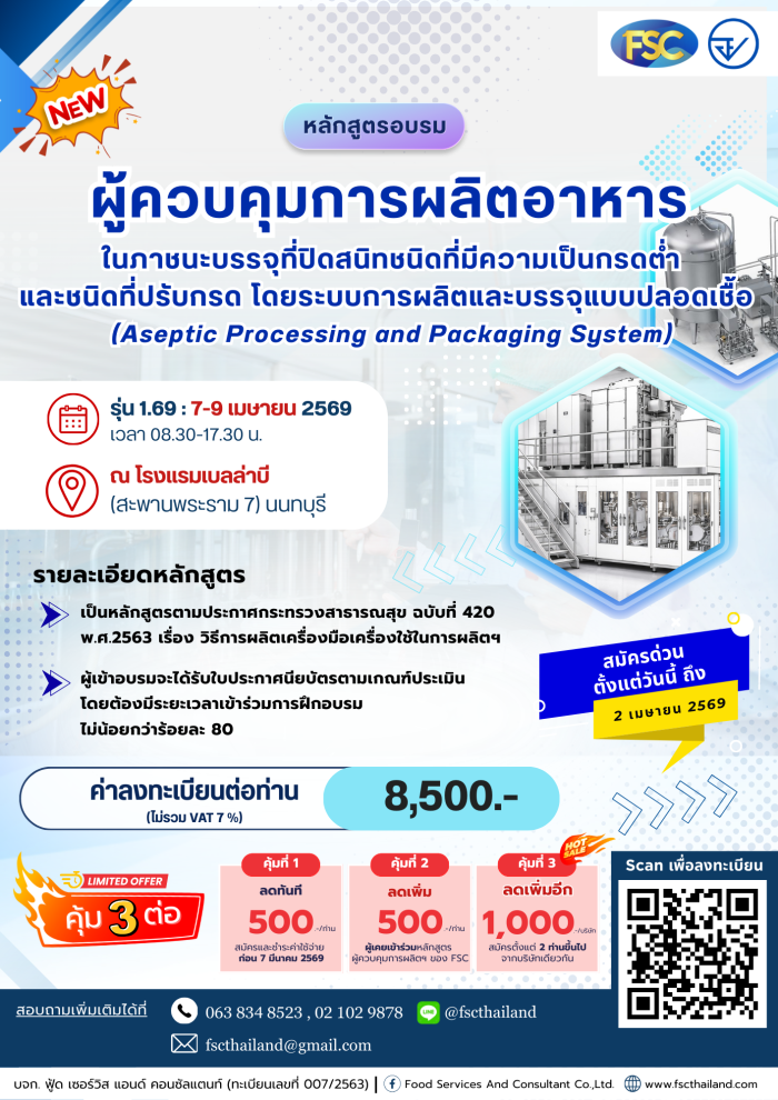 [อบรม] หลักสูตร "ผู้ควบคุมการผลิตอาหารในภาชนะบรรจุที่ปิดสนิทชนิดที่มีความเป็นกรดต่ำ และชนิดที่ปรับกรดโดยระบบการผลิตและบรรจุแบบปลอดเชื้อ (Aseptic Processing and Packaging System)" วันที่ 7-9 เมษายน 2569