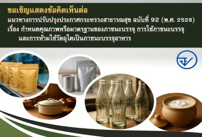 ขอข้อคิดเห็นต่อแนวทางการปรับปรุงประกาศกระทรวงสาธารณสุข ฉบับที่ 92 (พ.ศ.2528) เรื่อง กำหนดคุณภาพหรือมาตรฐานของภาชนะบรรจุ การใช้ภาชนะบรรจุ และการห้ามใช้วัตถุใดเป็นภาชนะบรรจุอาหาร